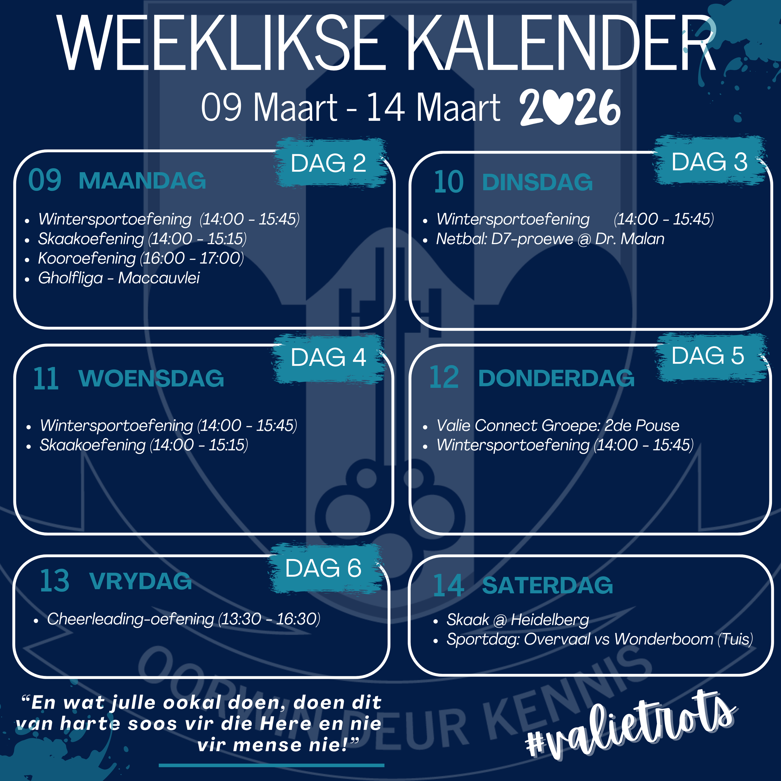 | Neem asseblief kennis dat die wintersportoefeninge in alle erns op Maandag 16 Februarie begin. Ons sien uit na ’n seisoen van harde werk, dissipline en mooi prestasies.