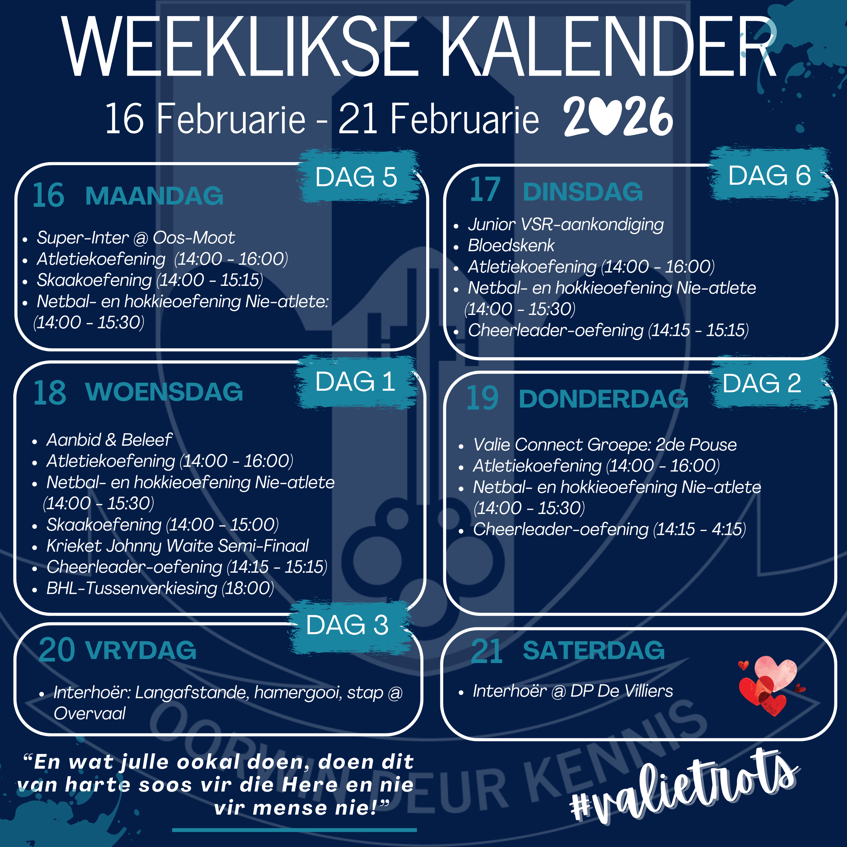 | Baie sterkte aan al ons leerders en personeel met die Super Interhoër. Ons sien uit na ’n uitstekende byeenkoms waar gees, deursettingsvermoë en trots weer sigbaar sal wees. Sterkte ook aan almal wat Saterdag aan die interskolebyeenkoms by DP de Villiers deelneem — dra ons skoolkleure met trots.