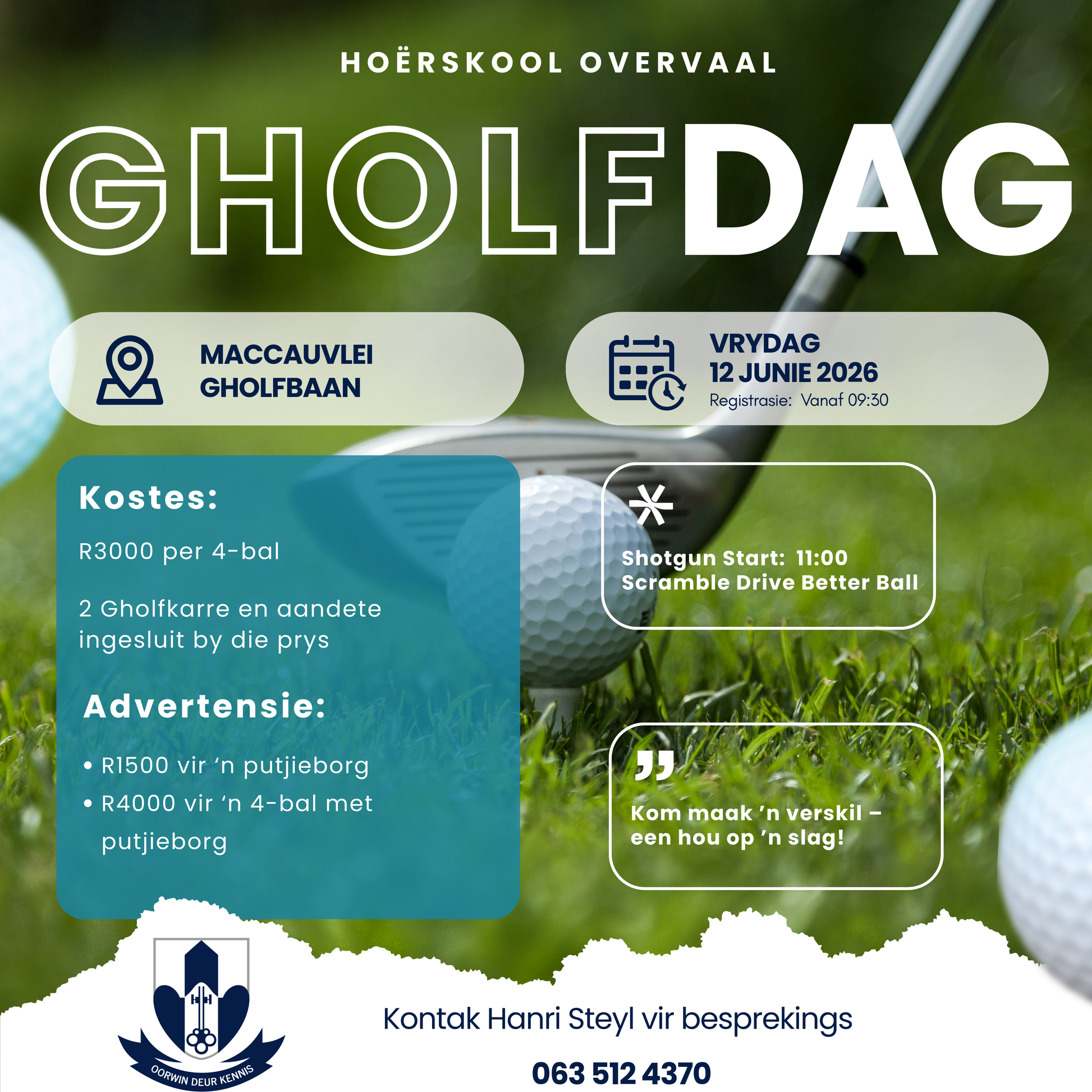 Ons nooi al ons ouers, oudleerders, sakelui en Valie-vriende om deel te wees van hierdie spesiale fondsinsamelingsdag. Dis meer as net gholf – dis ’n geleentheid om saam te kuier, nuwe verhoudings te bou en ’n verskil in ons leerders se toekoms te maak.